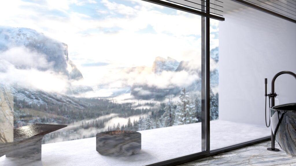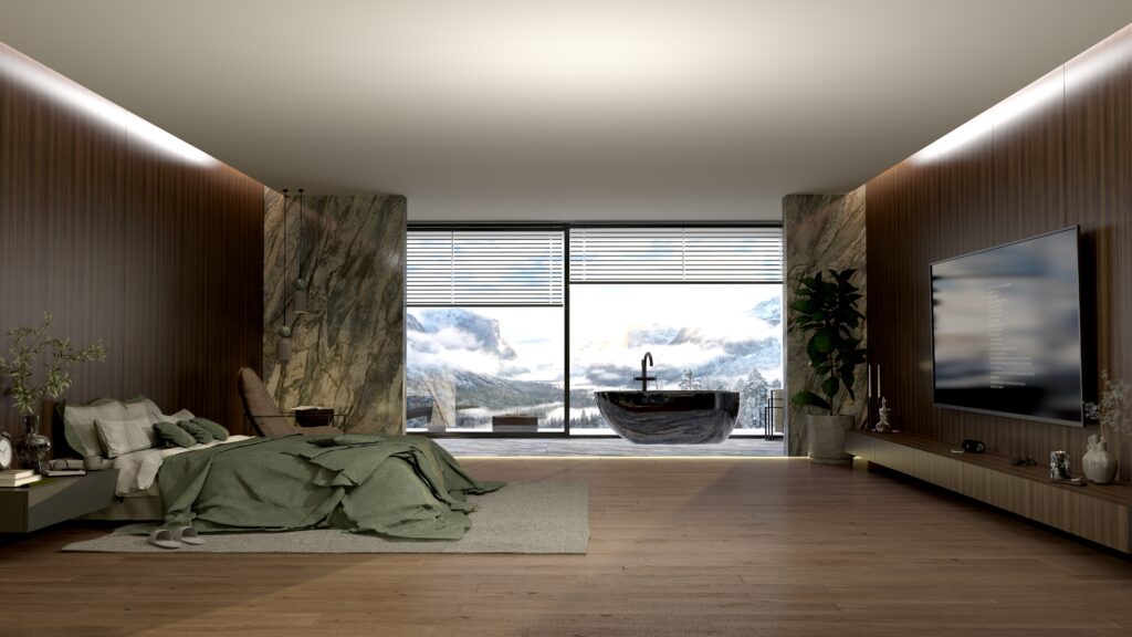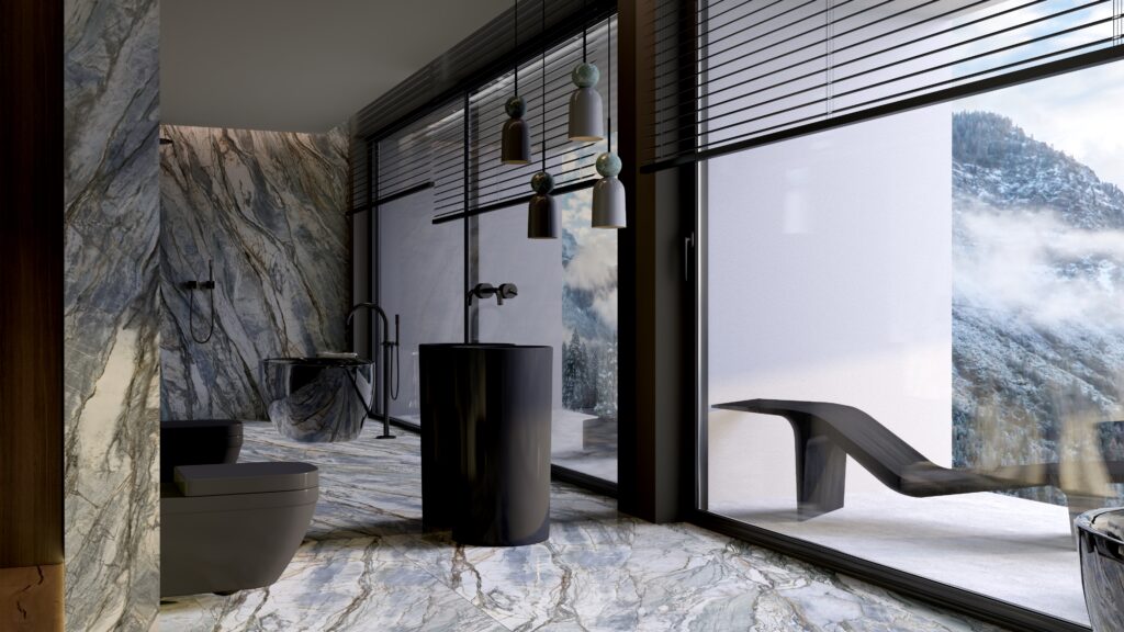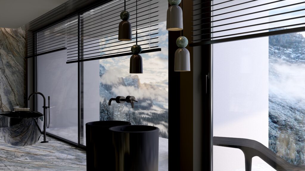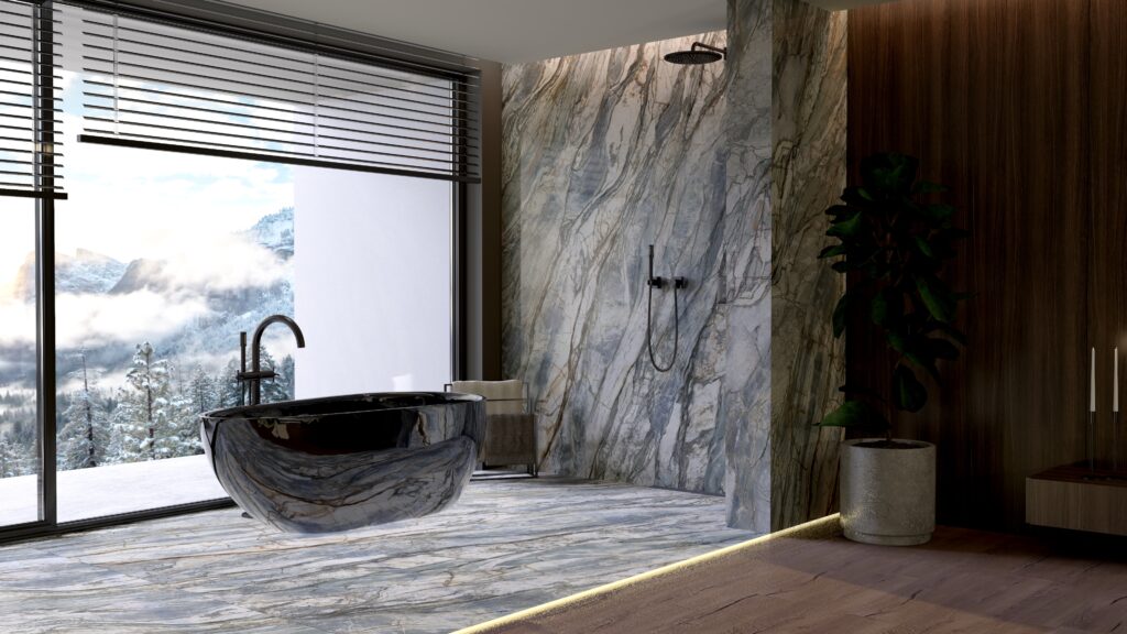 - Centralny punkt: Wolnostojąca wanna ustawiona w otoczeniu panoramicznych okien – kąpiel w takiej przestrzeni daje wrażenie bliskości natury. Ciemna wanna, kontrastująca z zielonym marmurem, podkreśla wyrafinowany design.