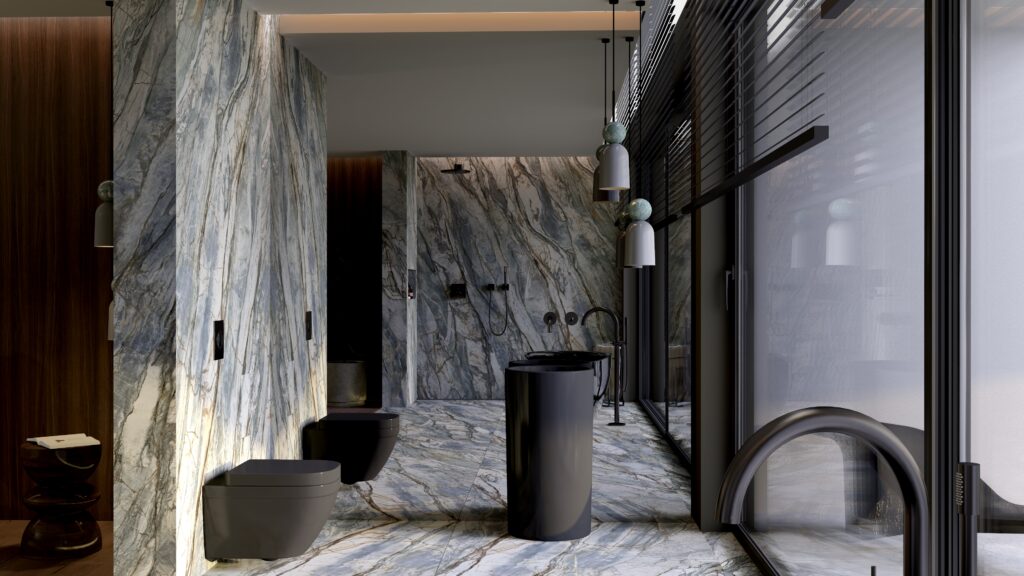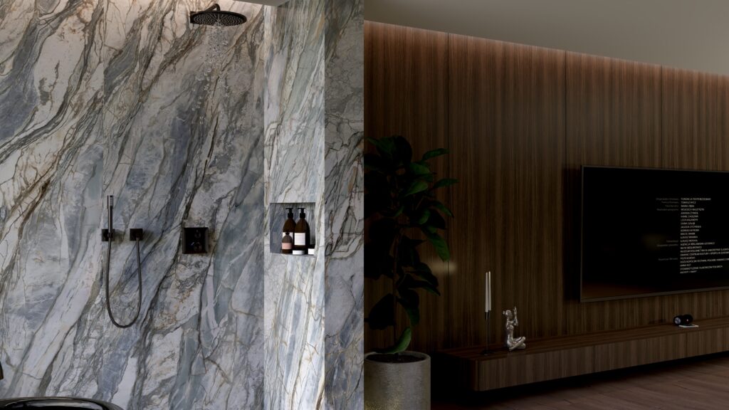 - Strefa prysznicowa: Wykończona marmurem z dynamicznymi żyłami, inspirowana naturalnymi wodospadami. Armatura GROHE dopełnia nowoczesnego charakteru przestrzeni.