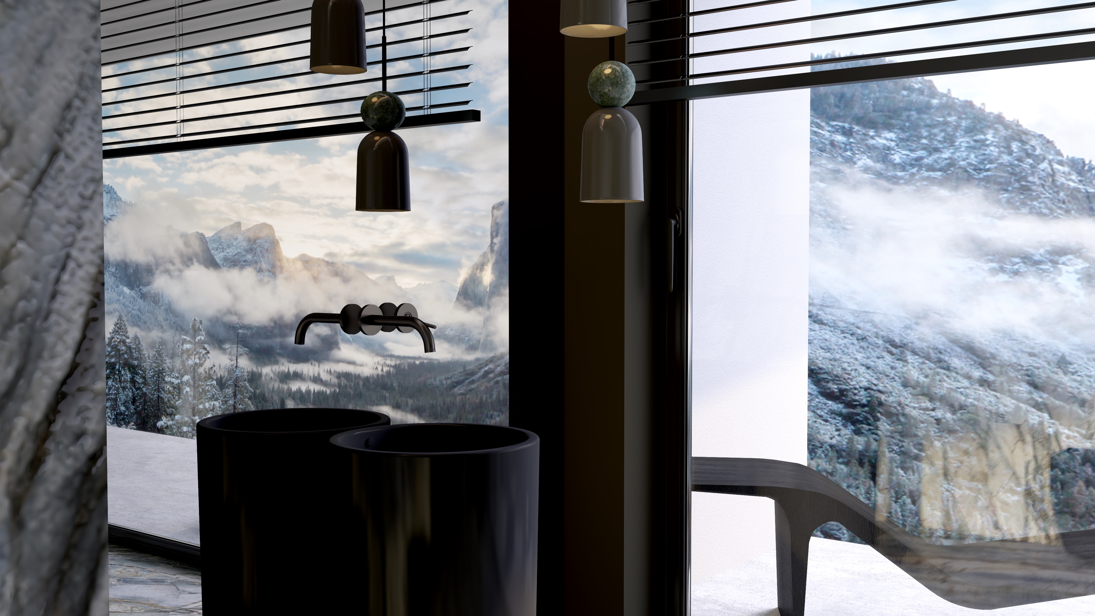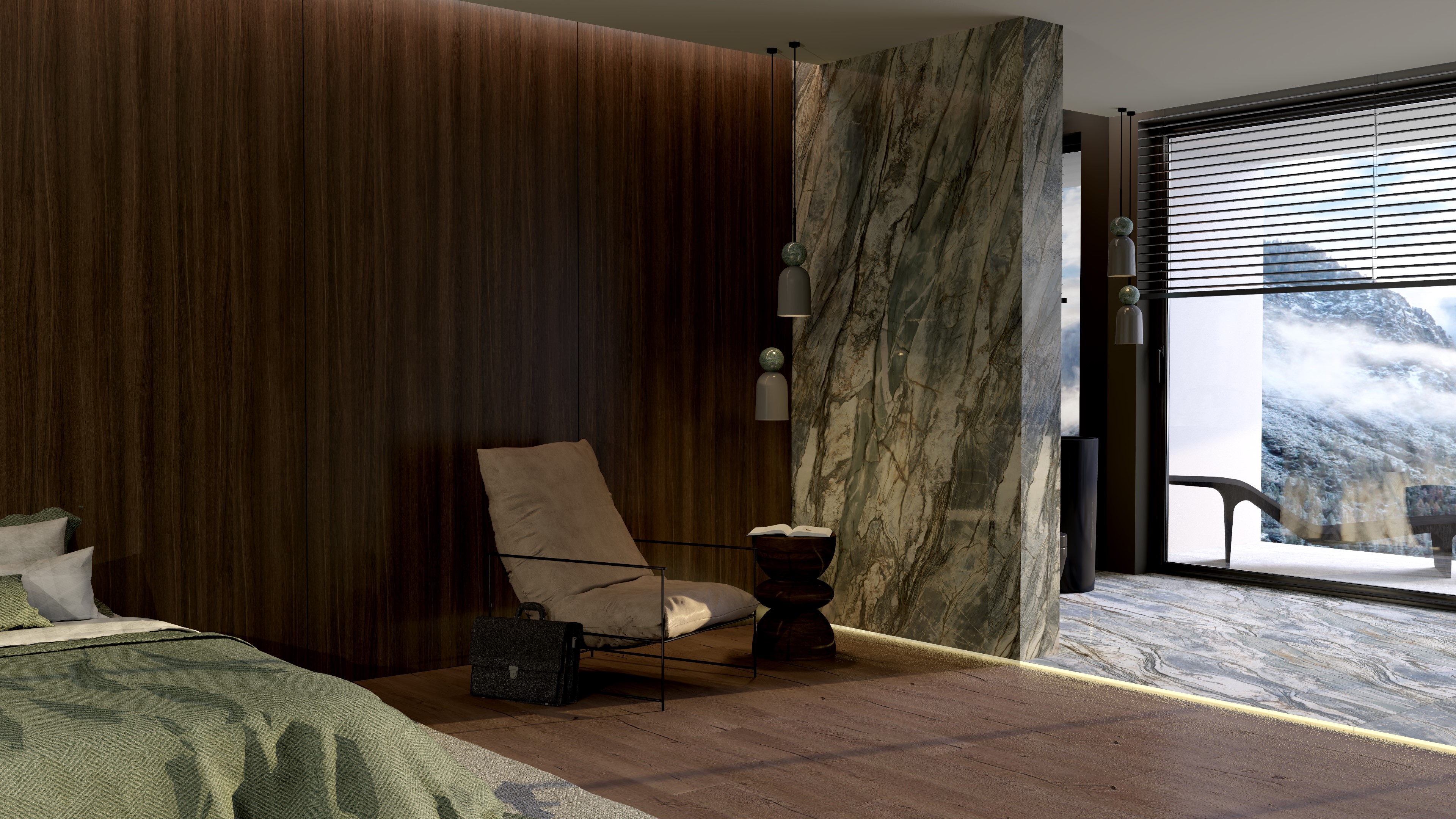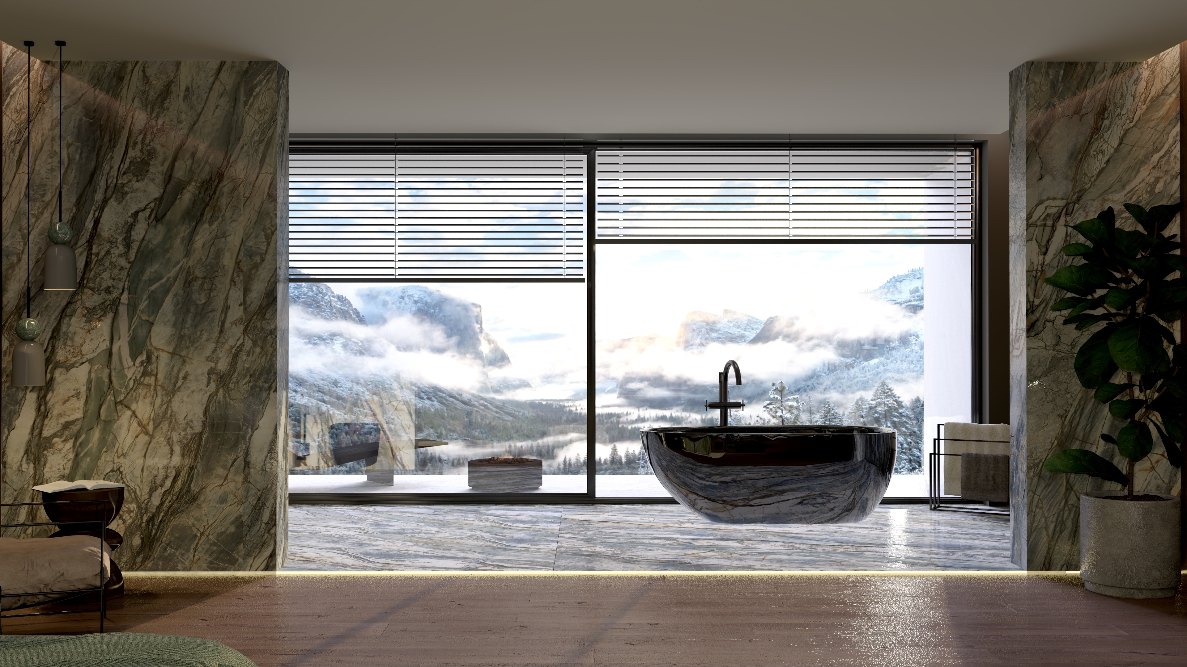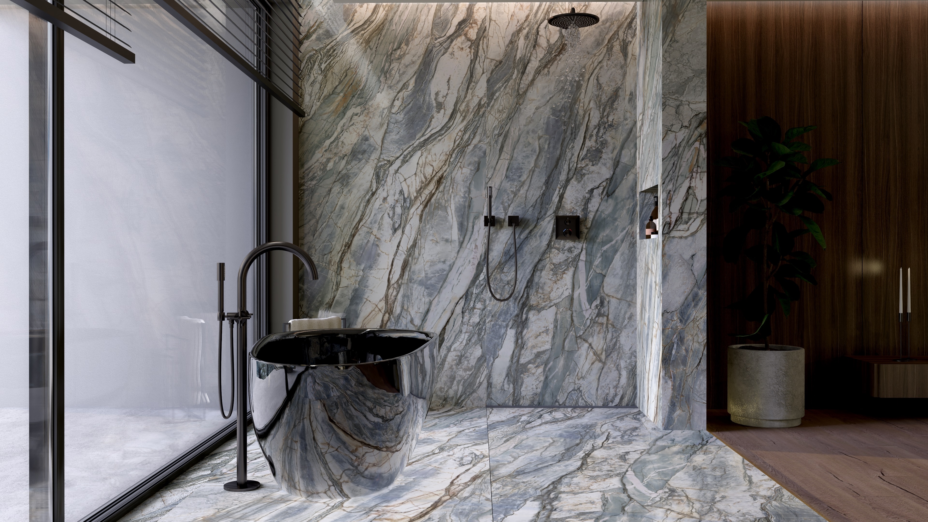 - Centralny punkt: Wolnostojąca wanna ustawiona w otoczeniu panoramicznych okien – kąpiel w takiej przestrzeni daje wrażenie bliskości natury. Ciemna wanna, kontrastująca z zielonym marmurem, podkreśla wyrafinowany design.