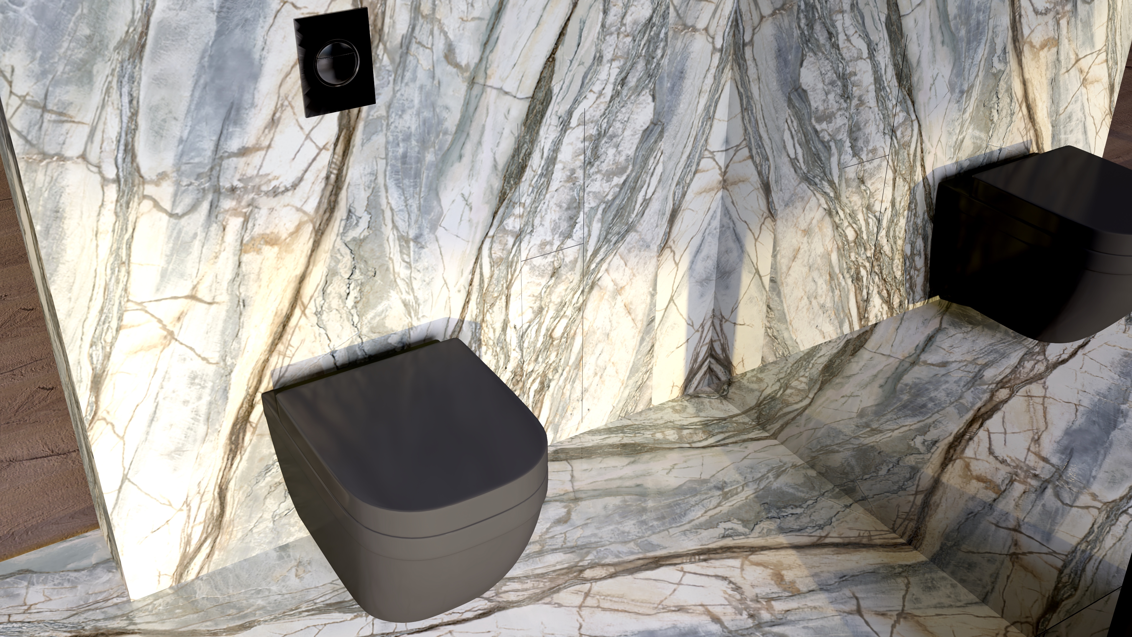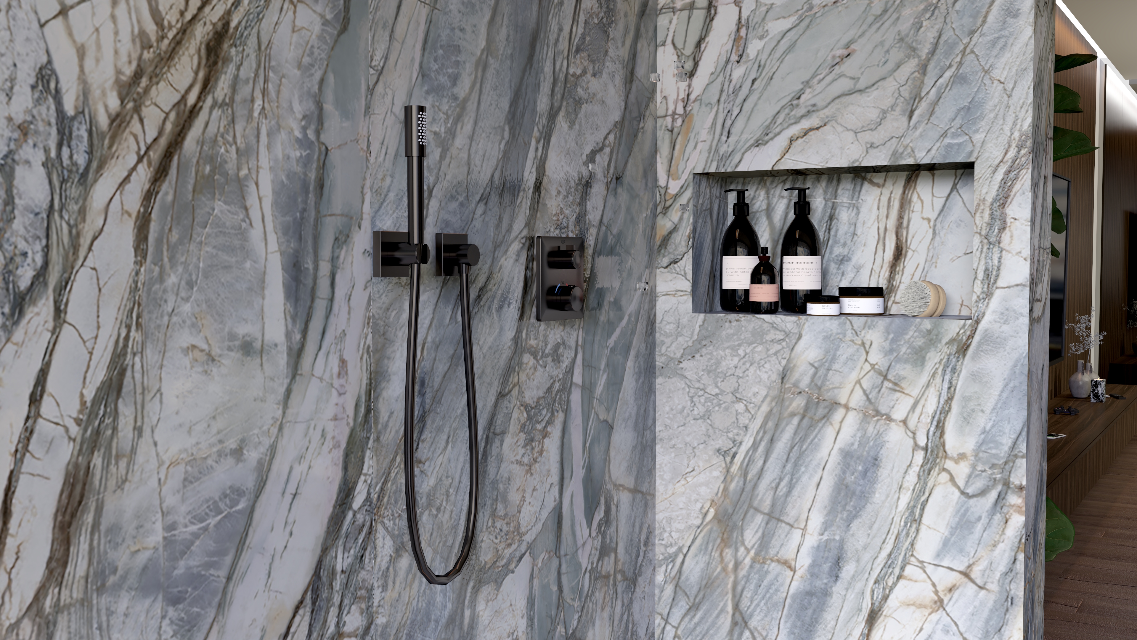 - Strefa prysznicowa: Wykończona marmurem z dynamicznymi żyłami, inspirowana naturalnymi wodospadami. Armatura GROHE dopełnia nowoczesnego charakteru przestrzeni.