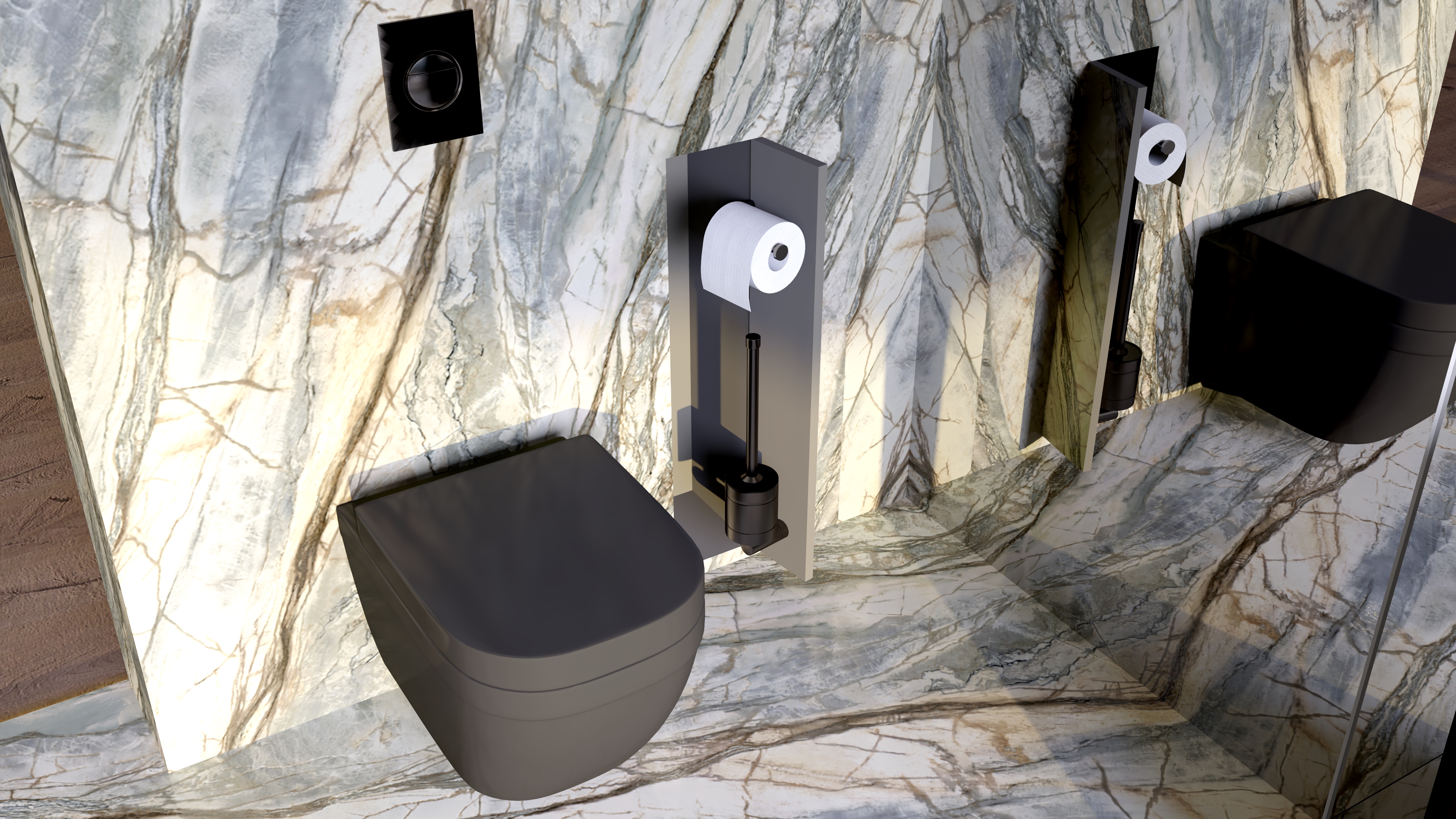 🟢 Podłogi i ściany: Luksusowy marmur z unikalnymi wzorami, symbolizujący siłę natury.